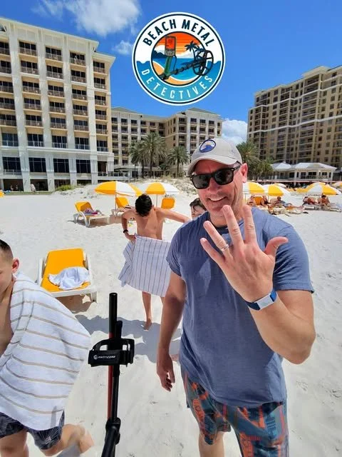 This day, Chris in town on Vacation from New Jersey visiting Clearwater Beach and staying at the Sand Pearl Resort. Beach Metal Detectives got the distress call from Chris’ Wife, joined a text chain with Chris. Chris called in the SOS around 1:30pm. By 2:30pm he had his Wedding ring back on his finger. The Valet guys at the Sand Pearl were ROCK STARS and let me park right up front. Chris & his buddy were waiting for me and they walked me back to the sugary sand of Clearwater Beach and gave me the small but sure search area. 30 seconds and 2 scoops later…CASE CLOSED!